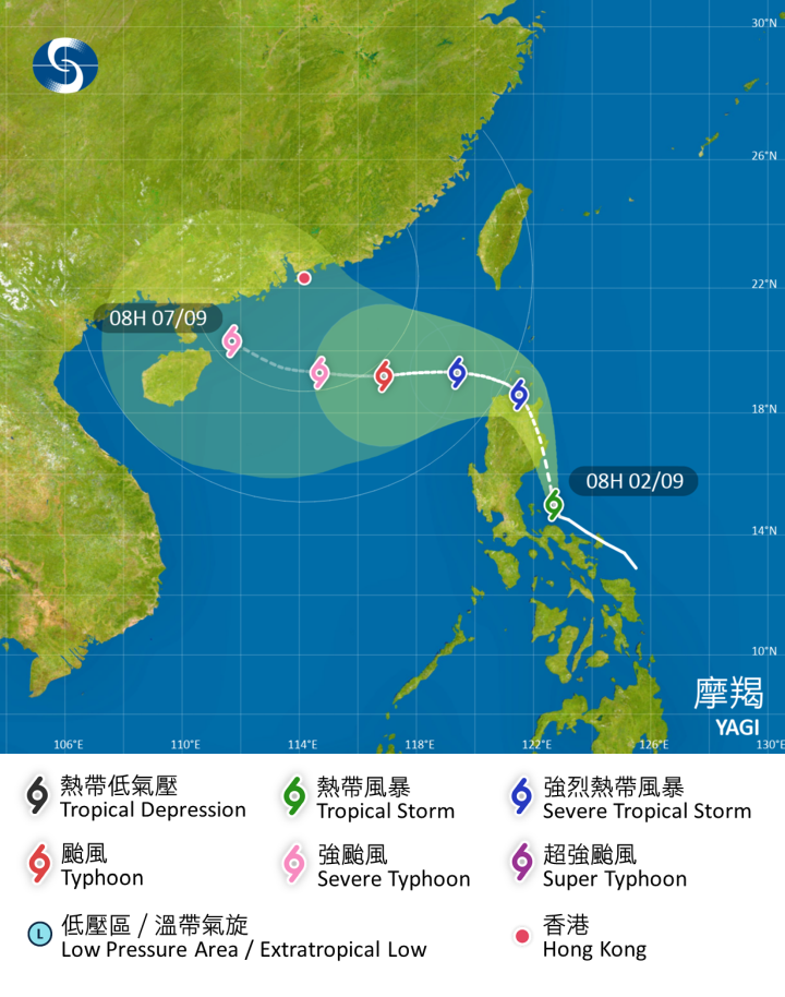 天文台表示,在過去數小時,熱帶風暴「摩羯」移向呂宋北部及有所增強。按照現時預測路徑,摩羯會在明日進入本港800公里範圍內,隨後會靠近華南沿岸,較大機會移向廣東西部至海南島一帶,並進一步增強。