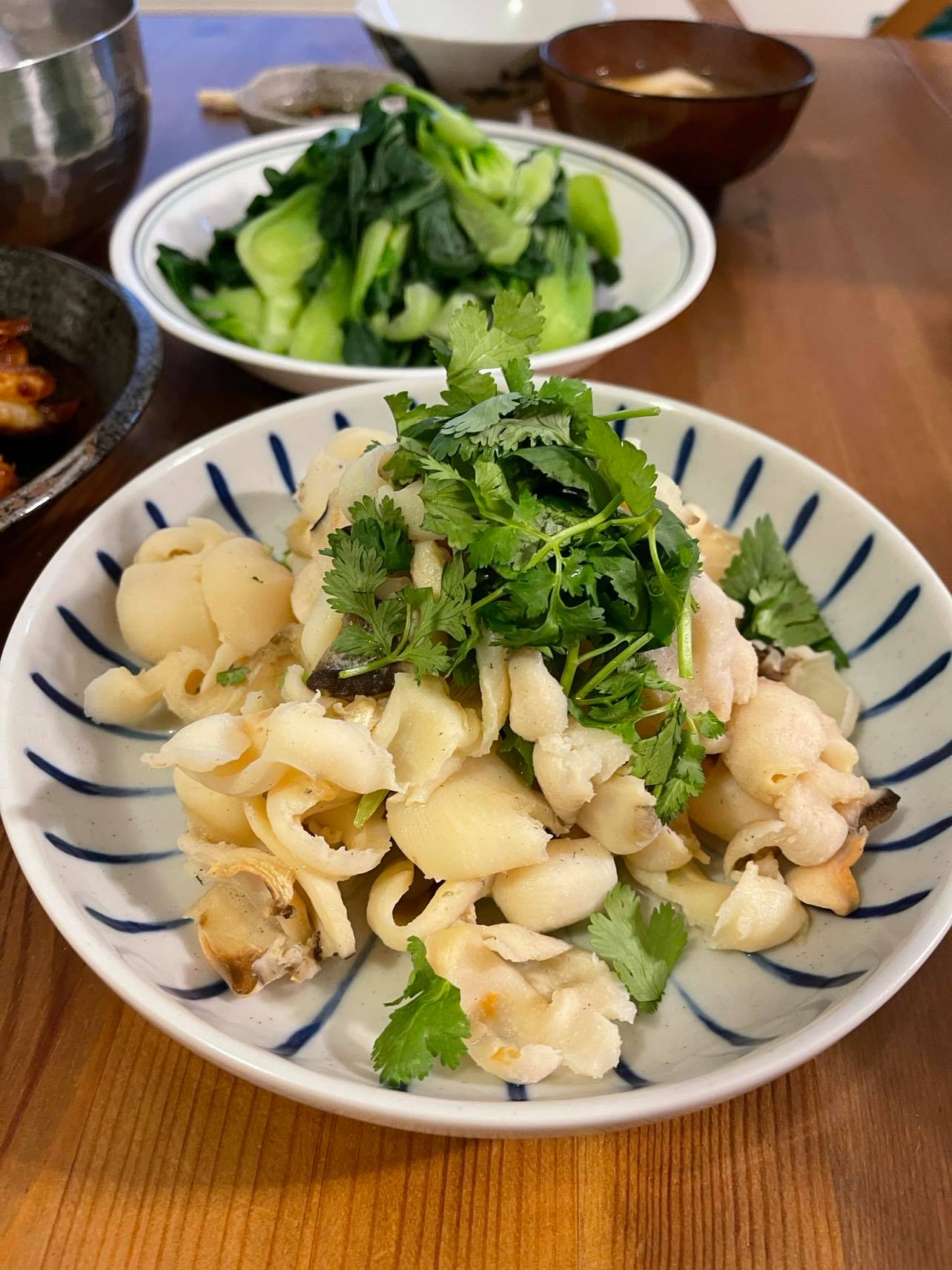 (2)水大滾時加入酒,落象拔貝片,灼30秒至1分鐘,或至一片片捲起即可撈起,撒上大量芫茜,沾辣椒豉油拌食(白灼可以用自己喜歡的材料,辣椒豉油的調味也可以自己斟酌更改)