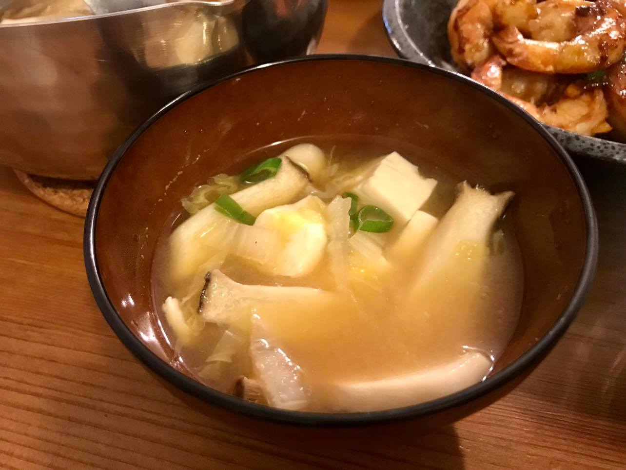 (1)一鍋水落紹菜煮至淋,加入皇子菇和豆腐粒,即時倒出半湯殼的水和赤味噌拌至無粒順滑