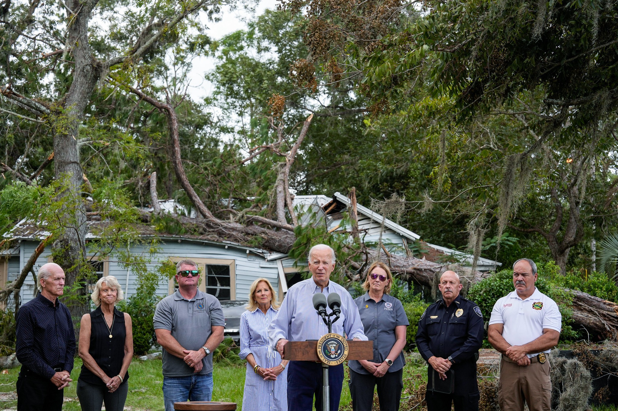 拜登視察佛州萊夫奧克,乘坐直升機視察災情,然後在一所小學會見前線救災人員和地方官員。