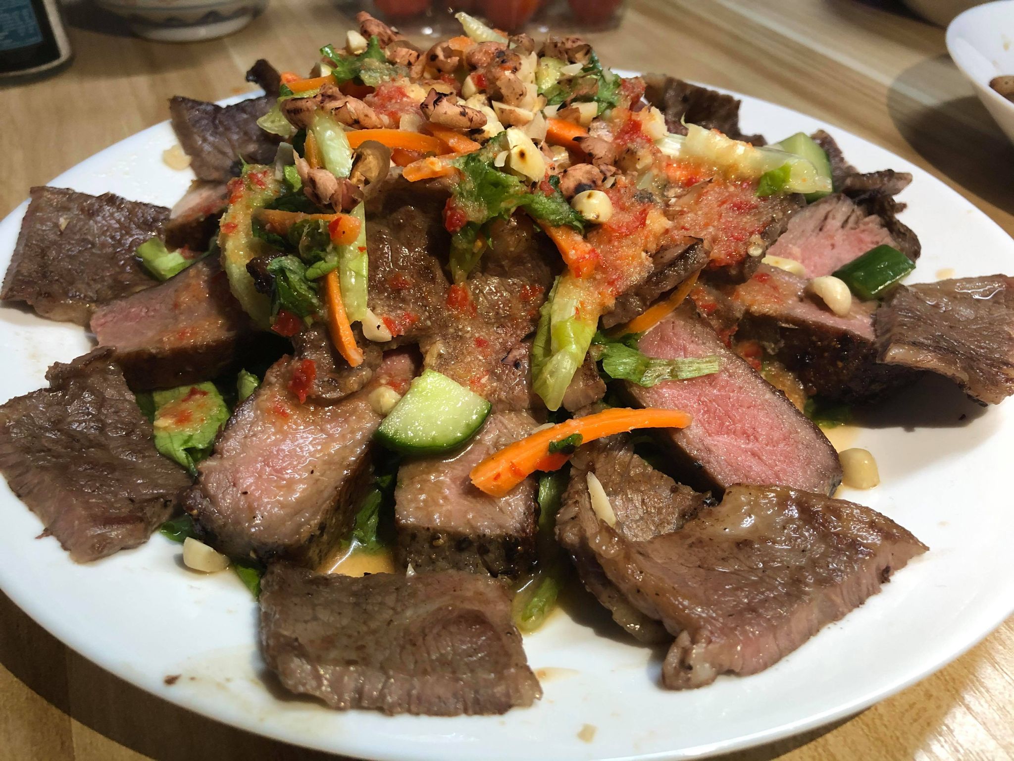 7. 擺盤,沙律在底,鋪上牛肉片,再加剩餘的沙律,撒上花生碎,按喜好倒沙律汁即可。