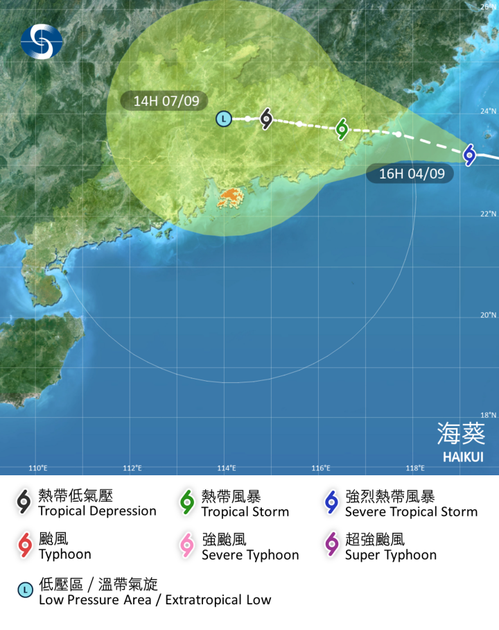一號戒備信號仍然生效,按照現時預測路徑,「海葵」會在明早(9月5日)於廣東東部至福建南部沿岸登陸,隨後移入廣東東部內陸並逐漸減弱,明早5時前改發更高熱帶氣旋警告信號的機會不大。