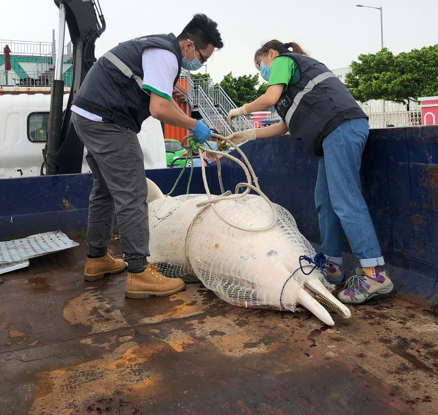白海豚屍體由海事及水務局人員打撈回岸,經市政署人員檢查和初步測量後,鑑定屬雌性成年中華白海豚,體長2.53米,發現時體表皮膚部分脫落,未見外傷,估計死亡後隨海水漂流至沿岸海域。