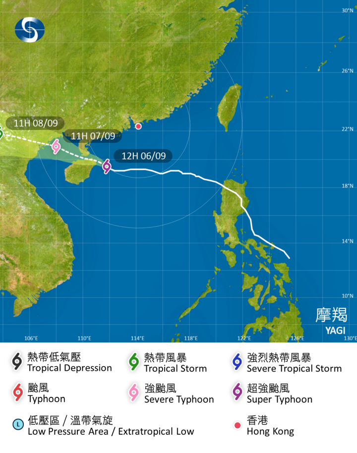 在下午1時,超強颱風「摩羯」集結在香港之西南約410公里,即在北緯19.6度,東經111.5度附近,預料向西北偏西移動,時速約18公里,移向海南島至雷州半島一帶。
