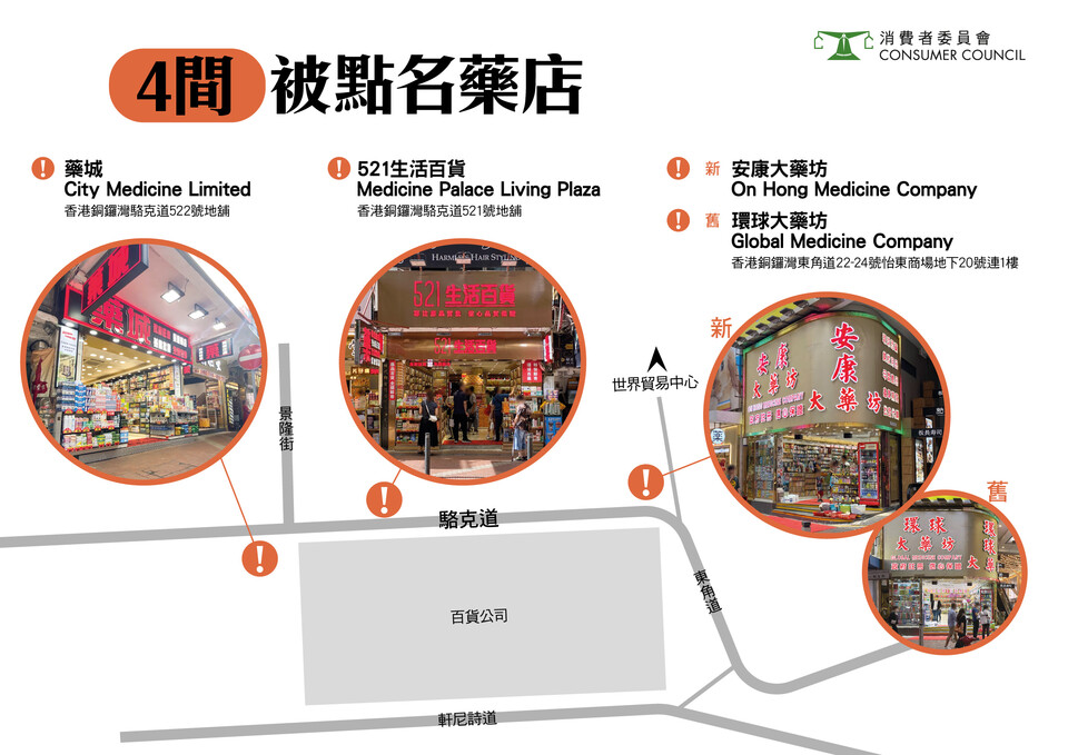 涉及的4間商戶包括「藥城」、「521生活百貨」、「環球大藥坊」、「安康大藥坊(前身為「環球大藥坊」)」,全部位於銅鑼灣。