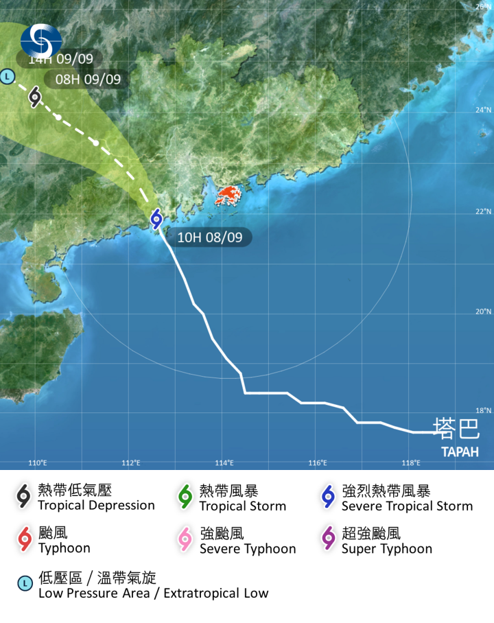 在上午10時,強烈熱帶風暴「塔巴」集結在香港之西南偏西約170公里,即在北緯21.9度,東經112.6度附近,預料向西北移動,時速約18公里,橫過廣東內陸。