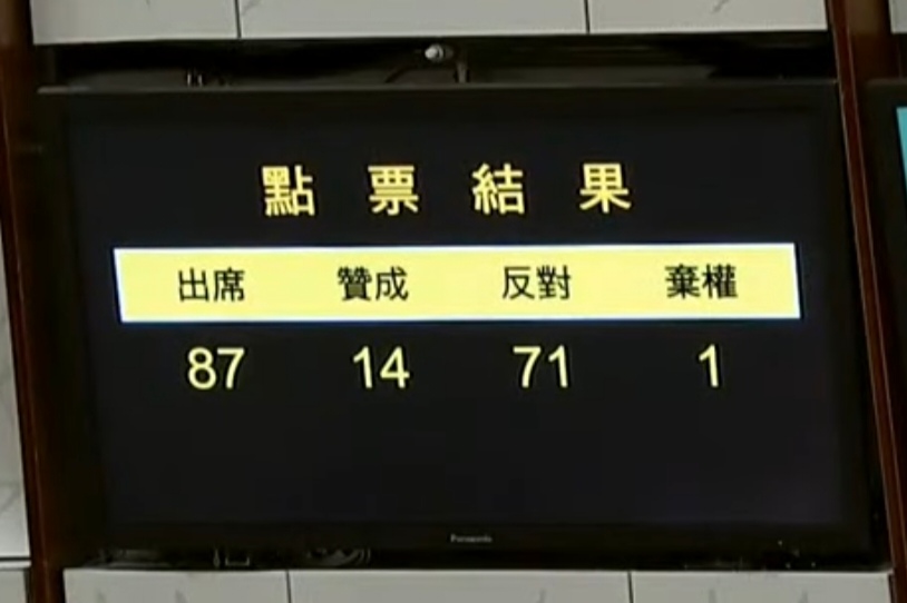 議案僅獲14票贊成、71票反對,1票棄權下被否決。