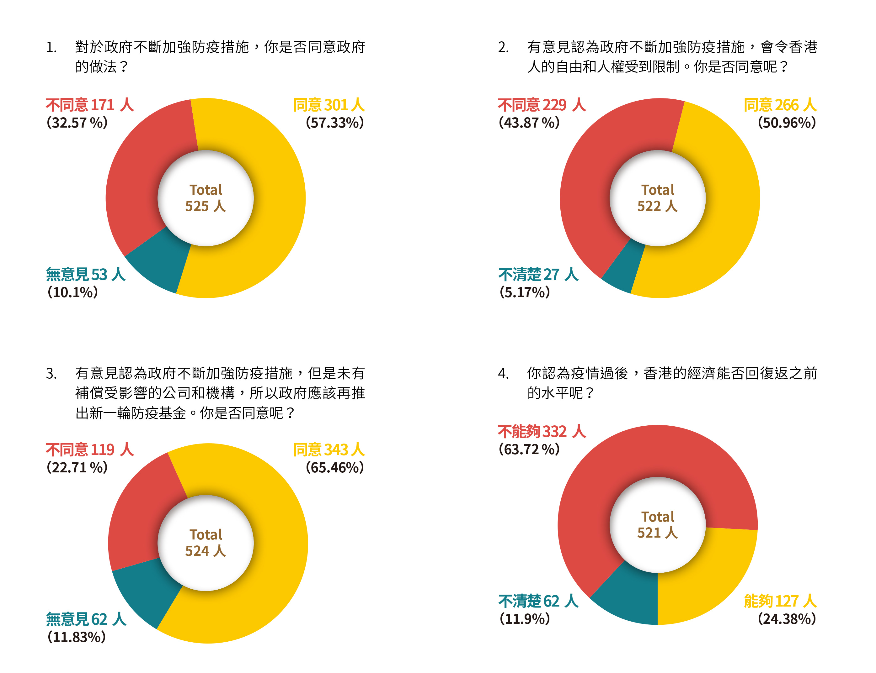 有意見認為政府不斷加強防疫措施,會令香港人的自由和人權受到限制,有一半人(266人,50.96%)同意此說,不同意的有近四成半人(229人,43.87%),不清楚的有半成(27人,5.17%)。反映市民並非不知道有關措施會損害個人自由,不過在瘟疫政治的恐懼之下,同意政府的做法。而比較本報今年4月所做的民調,有四成人(180人,41%)同意政府是借疫情進行極權管治而言,在四個月之間多了一成人發現政府的措施真相。