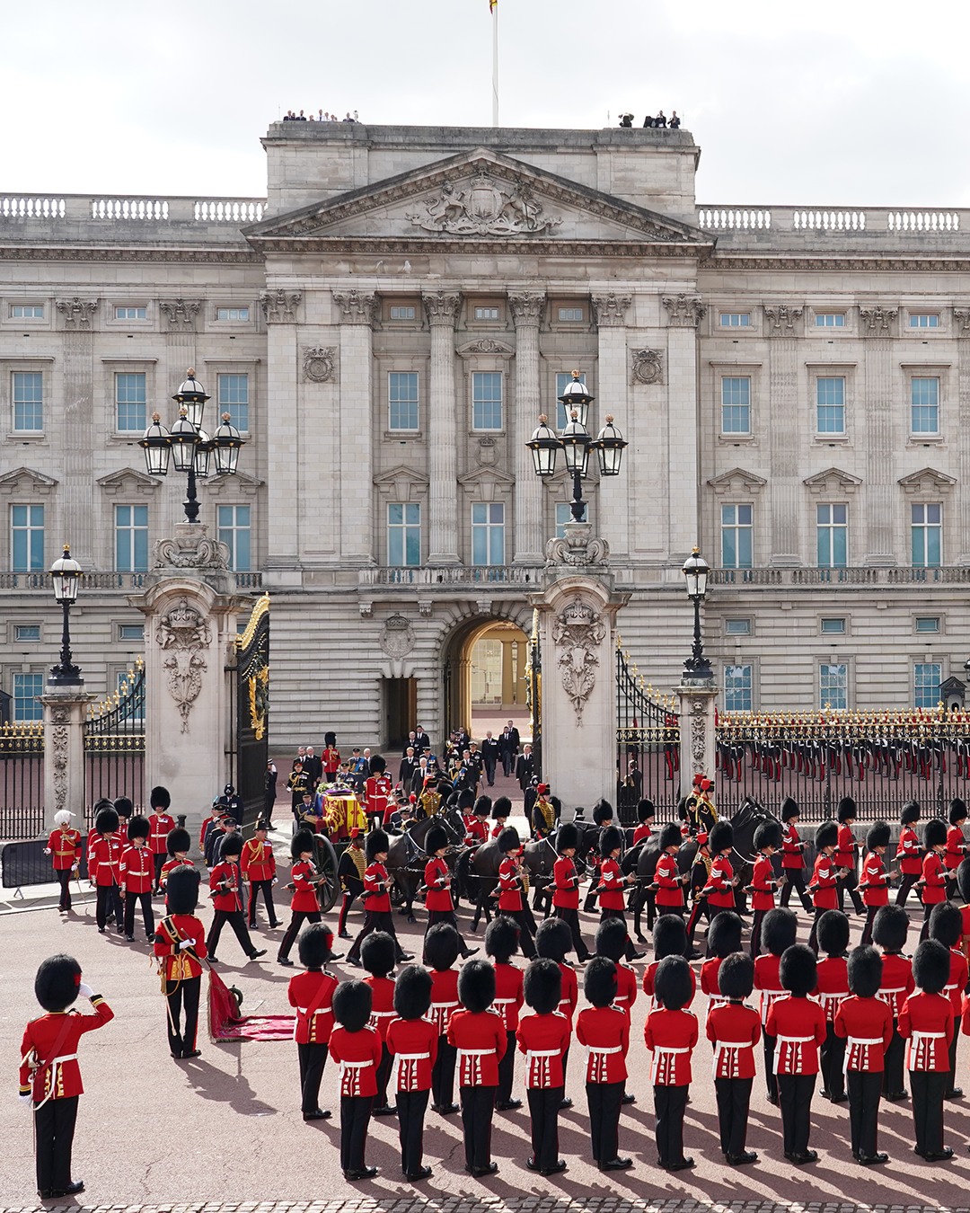 英皇查理斯三世引領隊伍護送,英女皇的另外3名子女,包括安妮公主、安德魯王子、愛德華王子,還有兩個孫兒威廉與哈利等皇室成員同行。沿途有民眾夾道送別,並鼓掌致意。