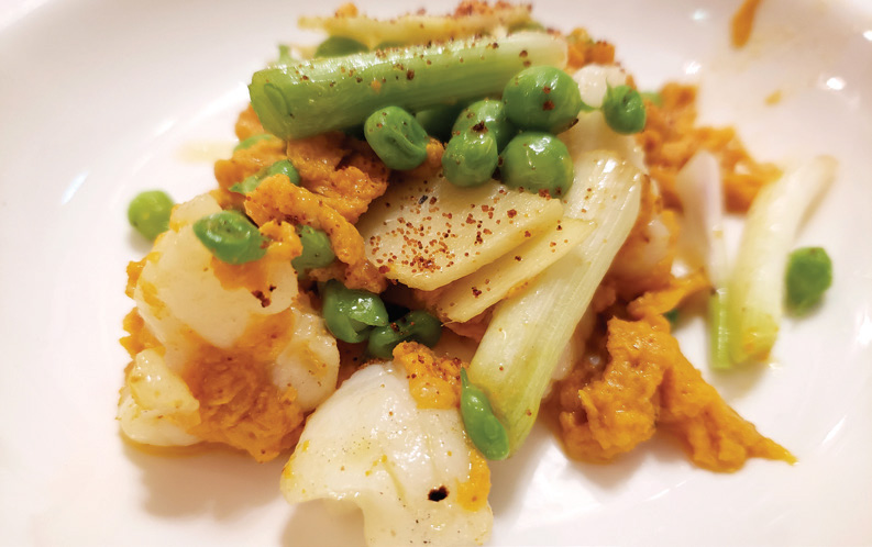 「蟛蜞醬炒琵琶蝦球」則是功夫菜。蟛蜞即淡水小蟹,體積與一元硬幣相若,取其卵子(又名禮雲子)作醬,並把琵琶蝦起肉,新鮮青豆則除去豆衣保留豆粒,伴薑片蔥段同炒,咸香惹味,下酒一流。招牌菜「雞油花雕蒸花蟹拌陳村粉」,花雕酒香撲鼻,混入雞油,醬汁變得甘香醇厚,加上鮮甜蟹肉,令陳村粉盡吸精華,成為菜式的靈魂。