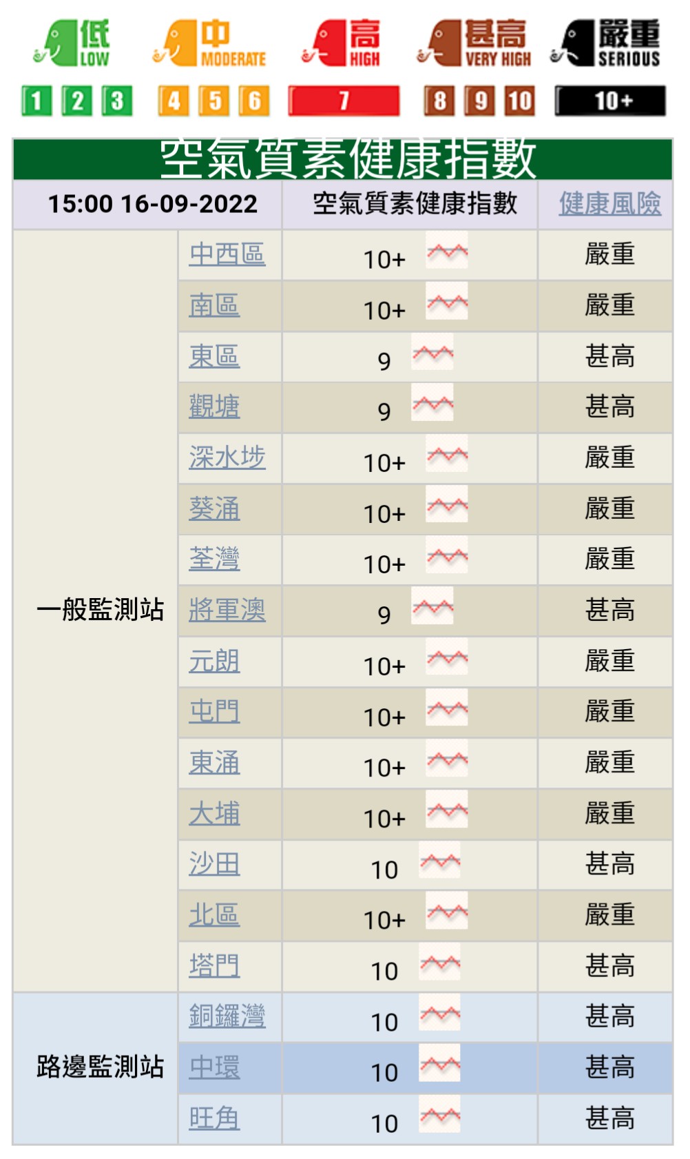 本港空氣質素近日持續欠佳,今午(9月16日)3時,全港10個一般監測站錄得空氣質素健康指數達「10+」的嚴重水平。