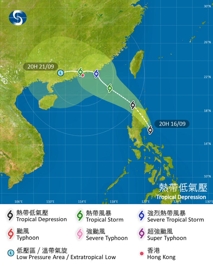 天文台表示,位於呂宋附近的低壓區已增強為熱帶低氣壓,會在今明兩日(9月16及17日)橫過呂宋一帶並進入本港800公里範圍。天文台會考慮在星期三晚上至星期四(9月18日)初時發出一號戒備信號。