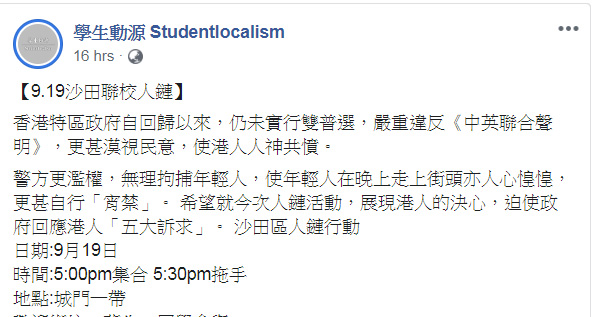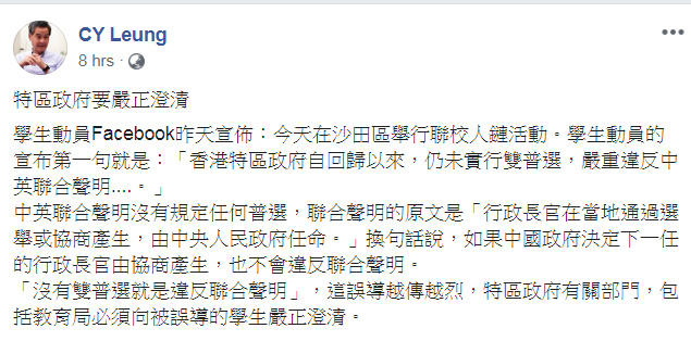 組織「學生動源」昨日在社交媒體指「香港特區政府自回歸以來,仍未實行雙普選,嚴重違反《中英聯合聲明》,更甚漠視民意,使港人人神共憤」。前特首梁振英今早在個人Facebook提及該貼文,指特區政府有關部門,包括教育局必須向被誤導的學生嚴正澄清。