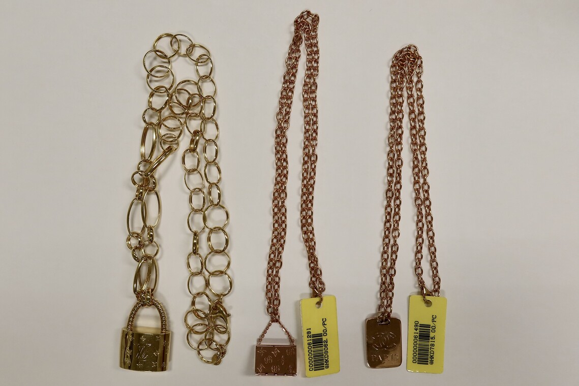 經調查後,海關人員昨日派員在一個展銷攤位購買一條懷疑冒牌Louis Vuitton頸鏈,及後在同一攤位內檢獲兩條懷疑冒牌Louis Vuitton頸鏈,市值共約港幣三萬。行動中,海關拘捕一名25歲女售貨員。