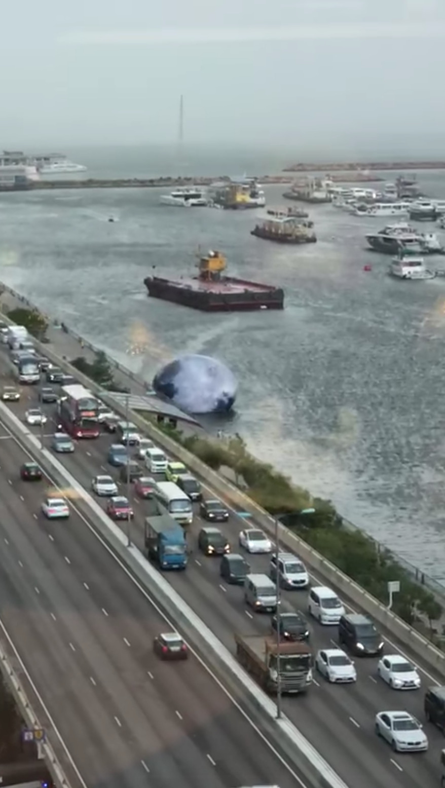 今晨(9月23日)有市民目擊於原於觀塘海濱設置的15米高巨型充氣月球被狂風吹倒,並於海面翻滾及漏氣。