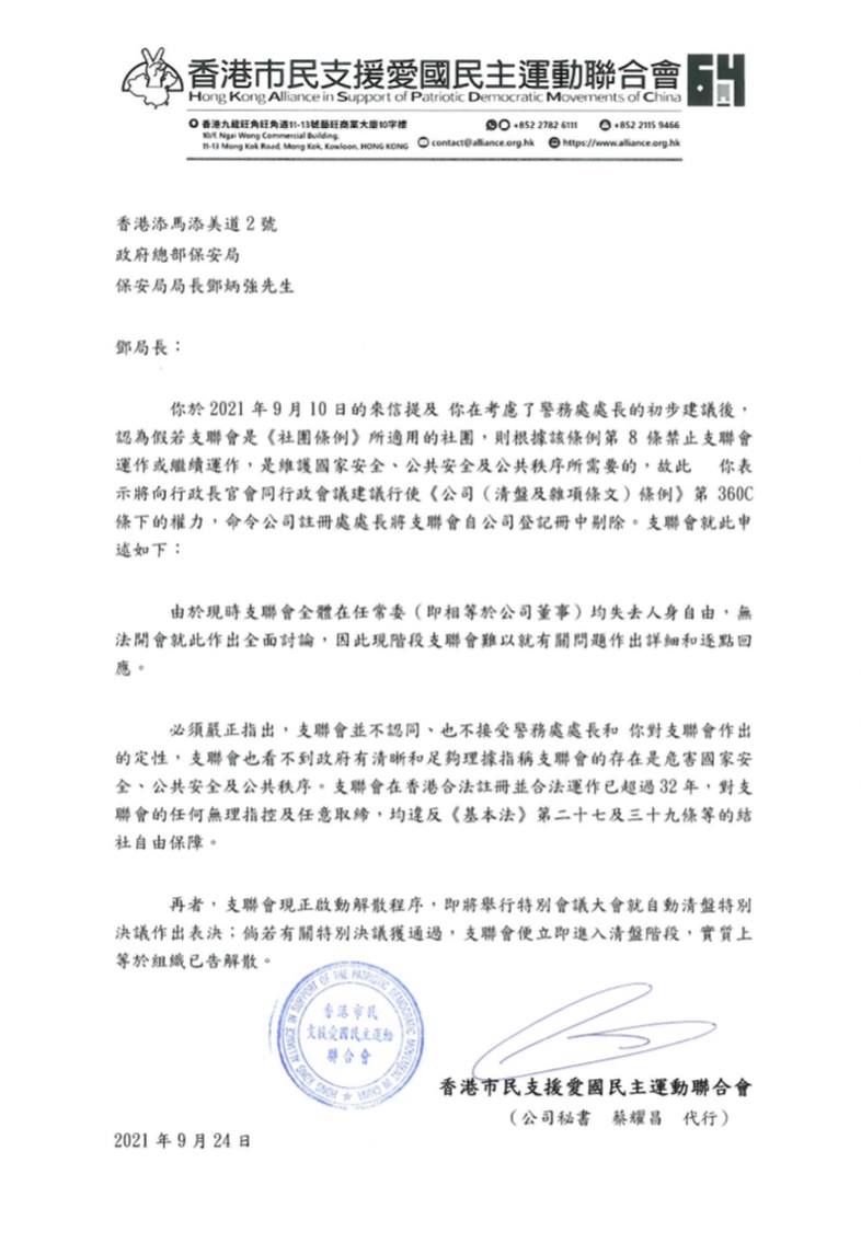 支聯會今日(9月24日)申述期限屆滿之日回覆鄧炳強,並在社交平台公開信件,指現時支聯會全體在任常委均失去人身自由,無法開會就此作出全面討論,並作出詳細回應。