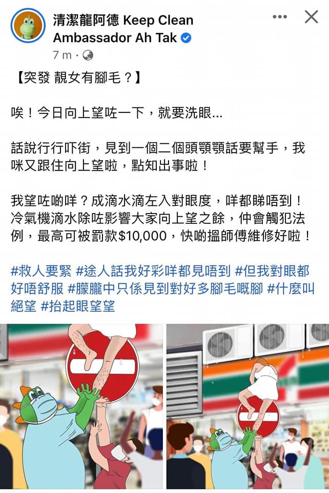 向來喜歡抽水的食環署吉祥物「清潔龍阿德」專頁,亦都加入戰團,於事後出Post抽水,指「靚女有腳毛」,來宣傳冷氣機滴水可被罰款10000元。然而,此Post一出,卻引來了熱議,最終搞到要刪帖收場,究竟所謂何事?
