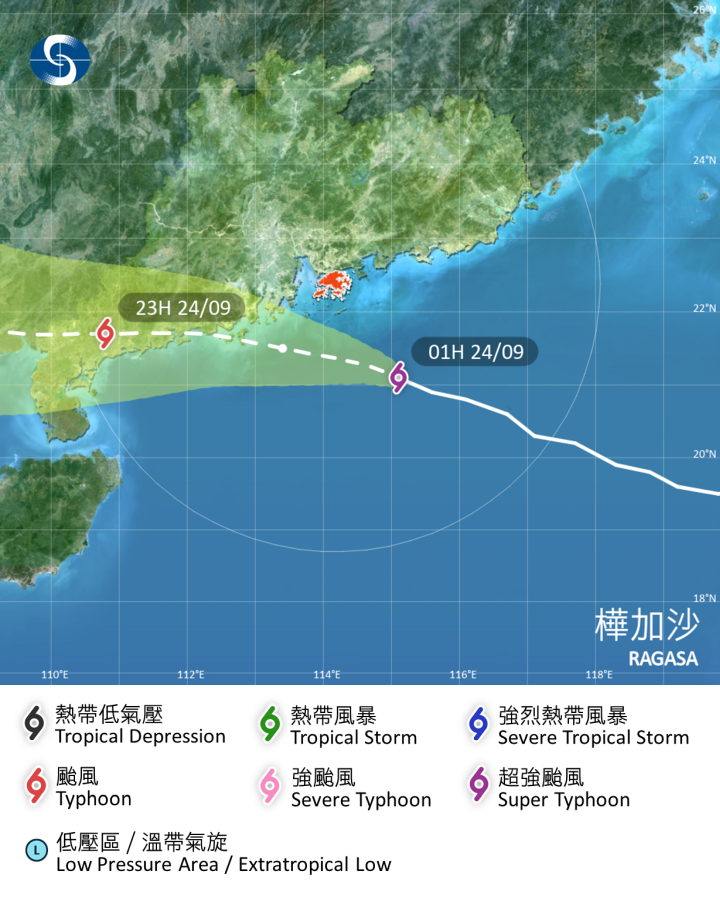 天文台表示,現時本港多處受烈風影響,部分地區吹暴風。預料超強颱風「樺加沙」會於今早(9月24日)最接近本港,在本港南面100公里左右掠過。隨著「樺加沙」的颶風區逐漸接近,本港風力將繼續增強,天文台會視乎本地風力變化,評估是否需要發出十號颶風信號。