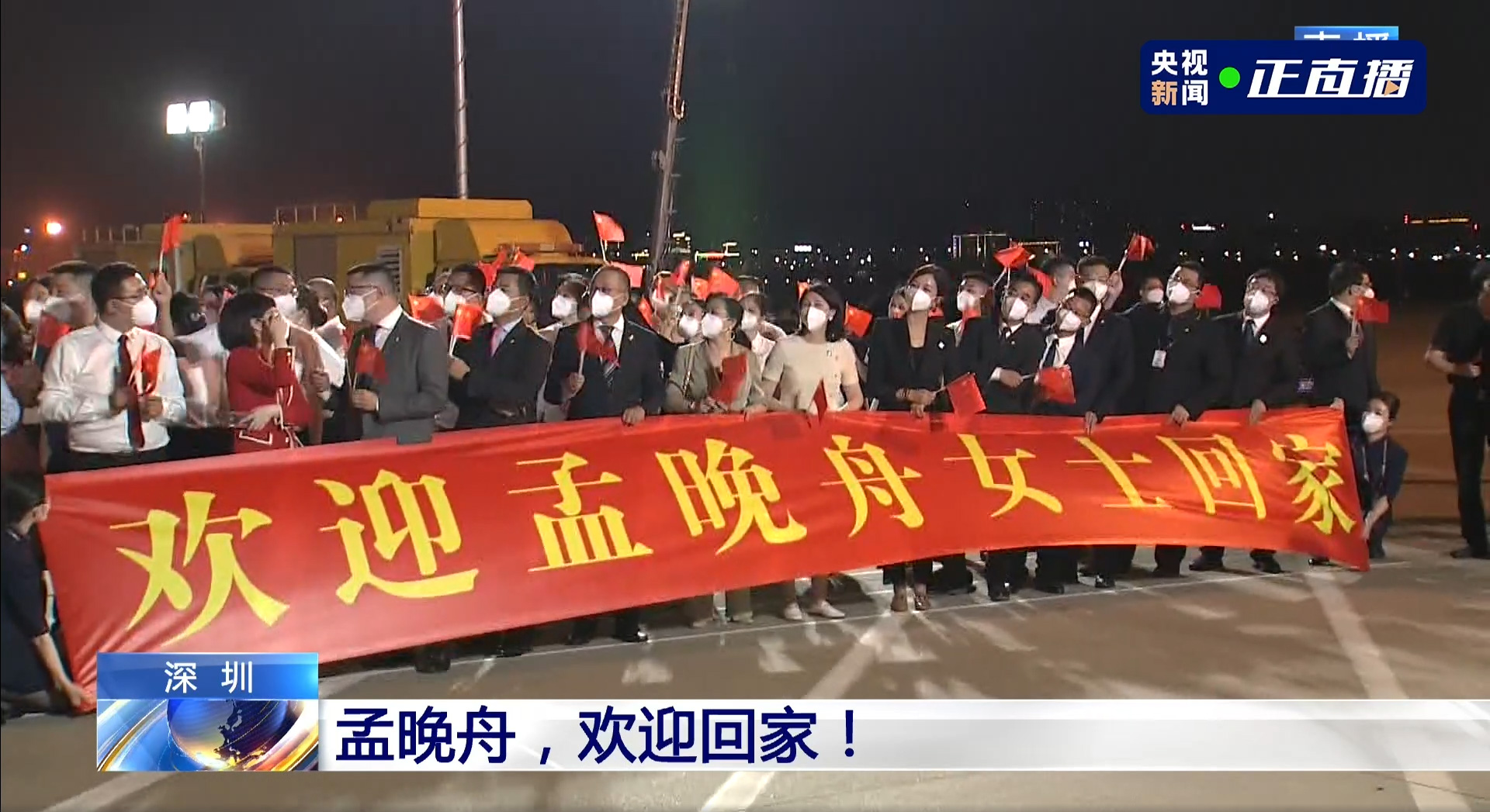 機場方面特意準備了火紅的玫瑰,有民眾列隊揮舞著國旗,拉起「歡迎孟晚舟女士回家」橫幅,歡迎孟晚舟回家。身穿紅色長裙的孟晚舟落機之後,向現場人士揮手,於停機坪發言時感謝祖國,她又提到國家主席習近平關心每一位中國公民安危,並把她的事情掛在心上,讓她深受感動。之後她上了小巴,接受檢測並隔離。