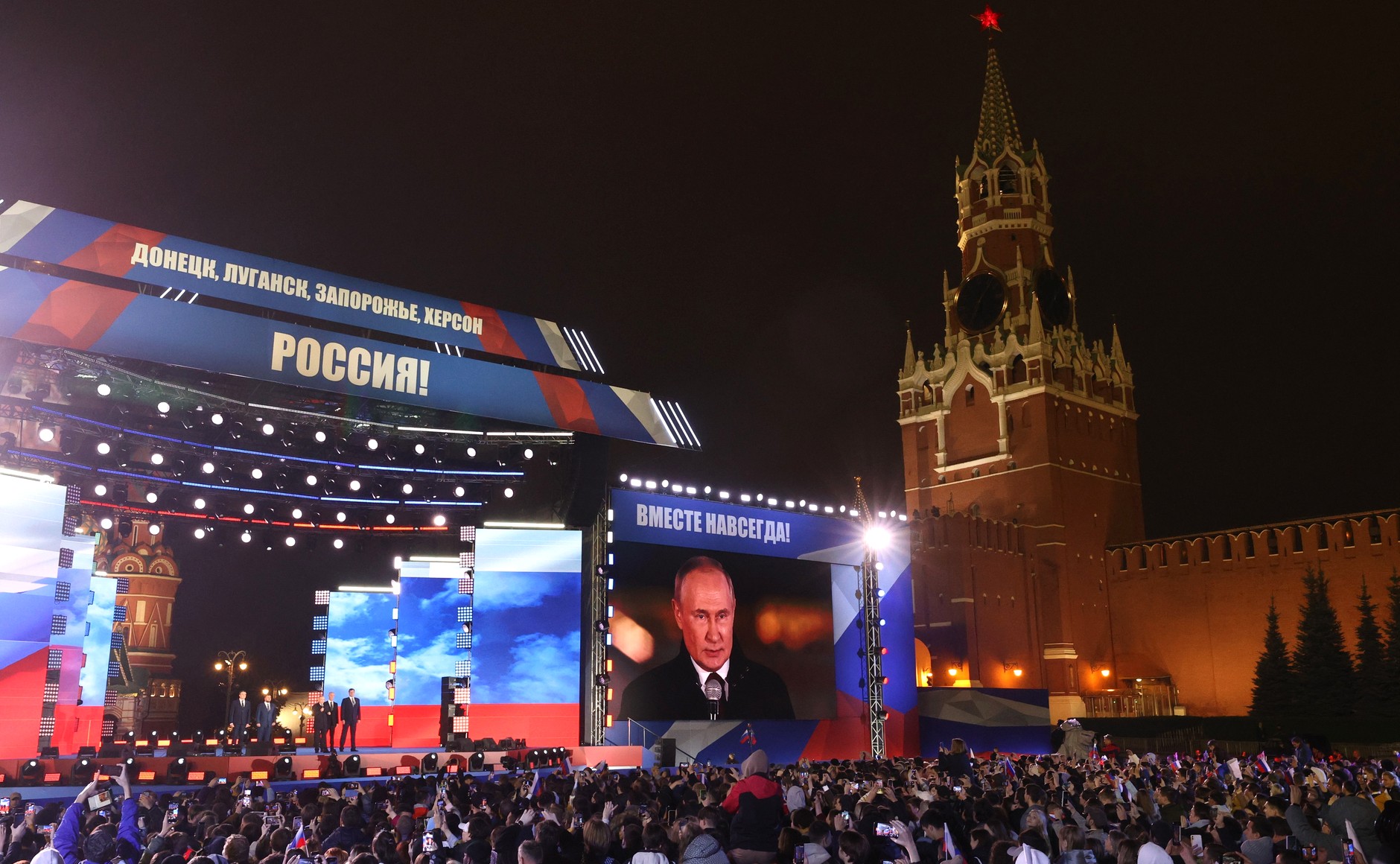 俄羅斯周五(9月30日)舉行新領土入俄條約簽署儀式,將早前公投通過入俄的4個烏克蘭州份,包括頓涅茨克、盧甘斯克、扎波羅熱和赫爾松併入俄羅斯。簽署儀式之後,紅場舉行音樂會慶祝,總統普京亦有出席。