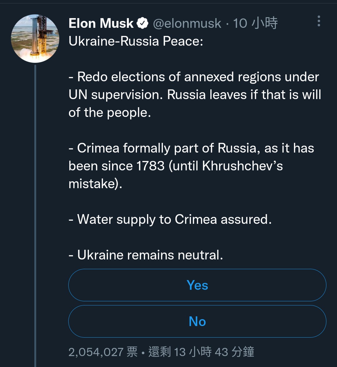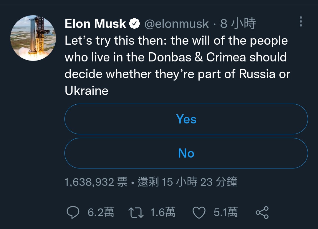 馬斯克又發起另一個民調,問題是「應該由頓巴斯與克里米亞居民的意志,決定他們是否是俄羅斯或烏克蘭的一部分嗎?」。