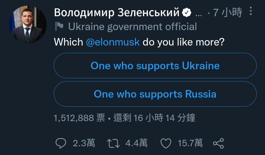 澤連斯基也在Twitter發起自己的民調反擊,問網友「你比較喜歡哪一個馬斯克?」選項有「支持烏克蘭的馬斯克」與「支持俄羅斯的馬斯克」。
