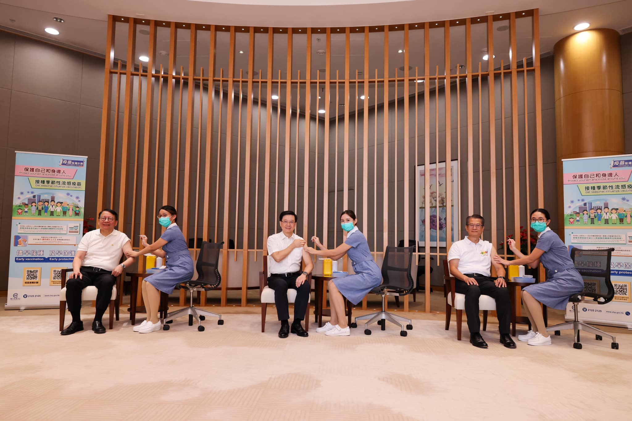 「政府防疫注射計劃」、「季節性流感疫苗學校外展(免費)計劃」及「院舍防疫注射計劃」現已展開,特首李家超、政務司司長陳國基及財政司司長陳茂波等官員,今早(10月5日)接種流感疫苗。