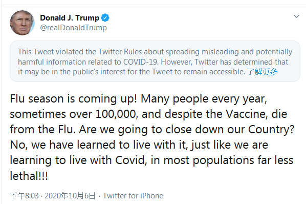 美國總統特朗普出院之後於社交網站貼文,指儘管有疫苗,每年仍有許多人死於流感,甚至超過10萬人,但卻不會封鎖國家應對,原因是已經學會與病毒共存,又指新型冠狀病毒的致命性不及季節性流感。