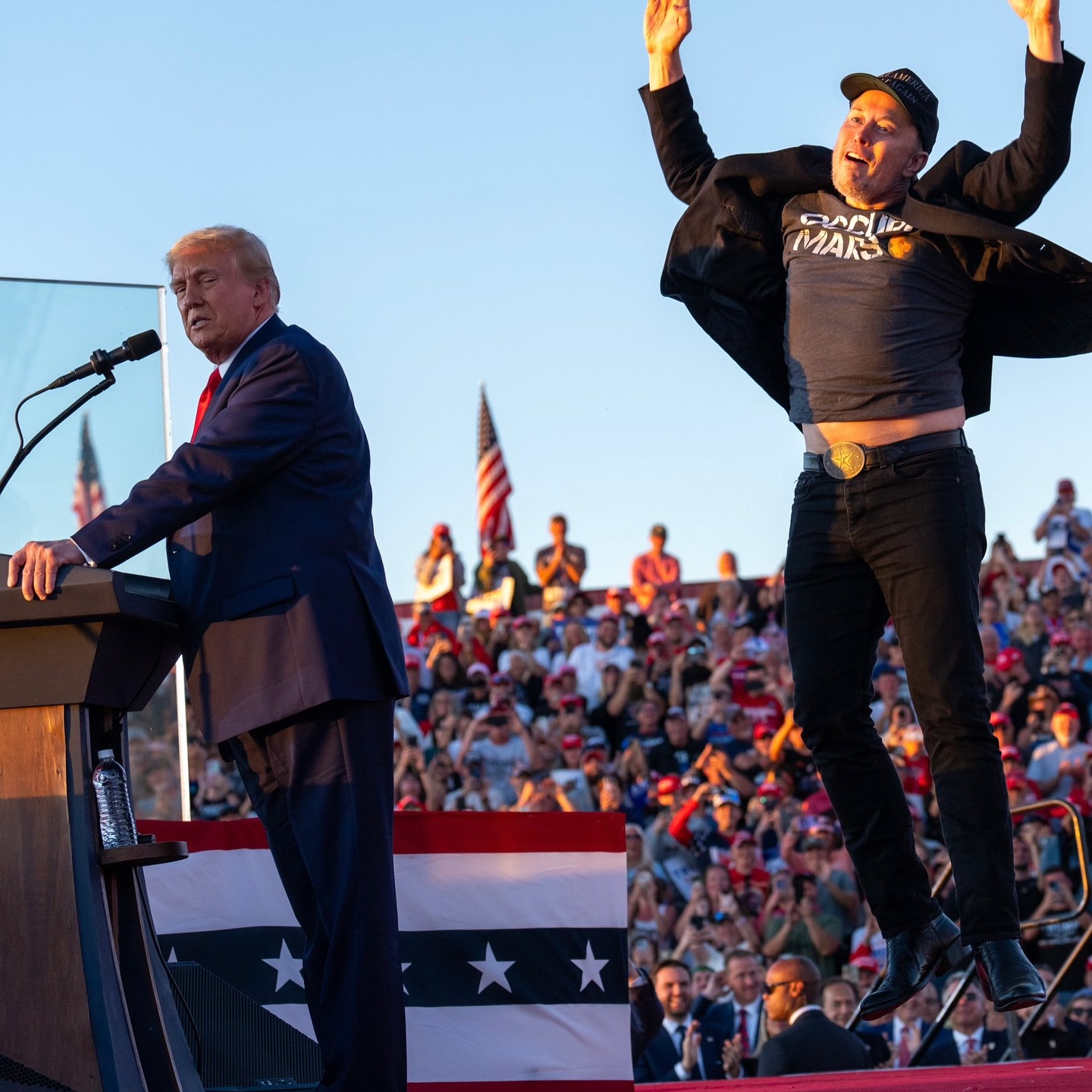 馬斯克頭戴黑色棒球帽,上面印有特朗普競選口號「讓美國再次偉大」(Make America Great Again)字樣,他警告要是特朗普沒選贏,這場選舉就會是最後一次選舉。他批評民主黨人想要奪走言論自由,奪走投票權,並繼續批評加州政府推動禁止查驗選民身分證的行動。