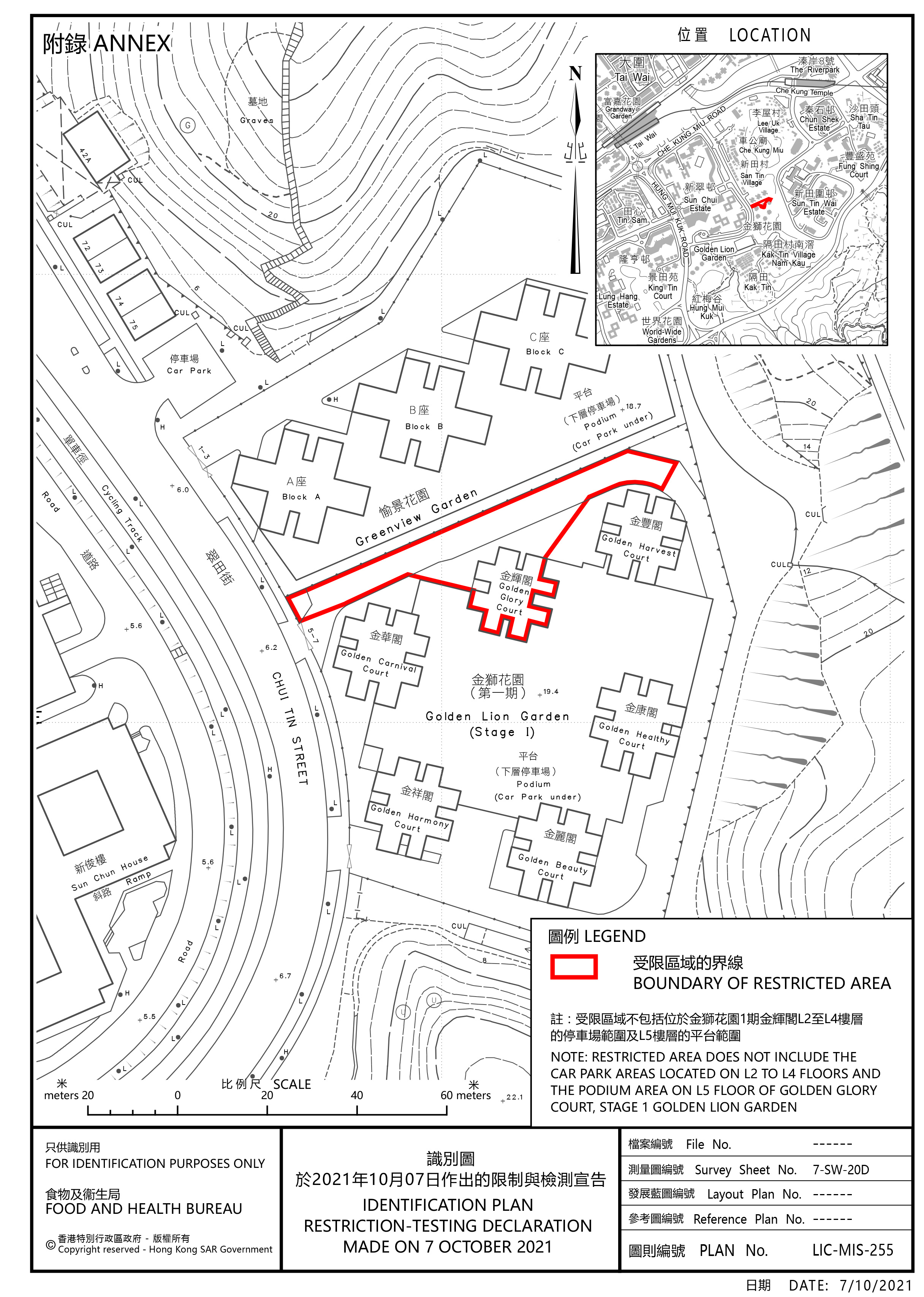 政府今日(10月7日)引用《預防及控制疾病(對若干人士強制檢測)規例》(第599J章),作出限制與檢測宣告,自晚上7時起限制在沙田指明「受限區域」,即沙田翠田街5-7號金獅花園第一期金輝閣內的人士,須留在其處所並接受強制檢測。受檢人士須在其處所等候,直至「受限區域」內所有已識別的受檢人士完成檢測,而相關檢測結果亦已獲大致確定,方可離開其處所。政府目標是在明日(10月8日)上午約6時完成此行動。