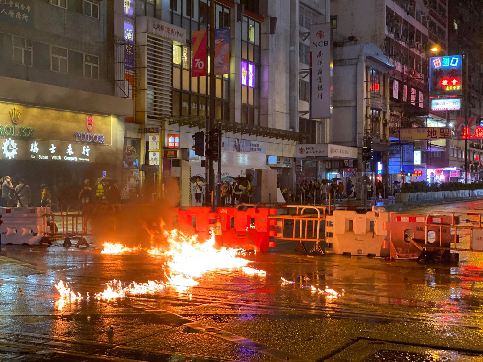 警方再發稿指,自入夜起,大批「暴徒」在旺角彌敦道一帶集結及破壞設施。晚上8時許,一輛警車行經彌敦道時,警車附近突然傳出爆炸聲。另外,「暴徒」又闖入旺角港鐵站內縱火。至晚上9時許,有「暴徒」向旺角警署投擲超過20枚汽油彈,警署門外一度火光熊熊,冒出大量濃煙。