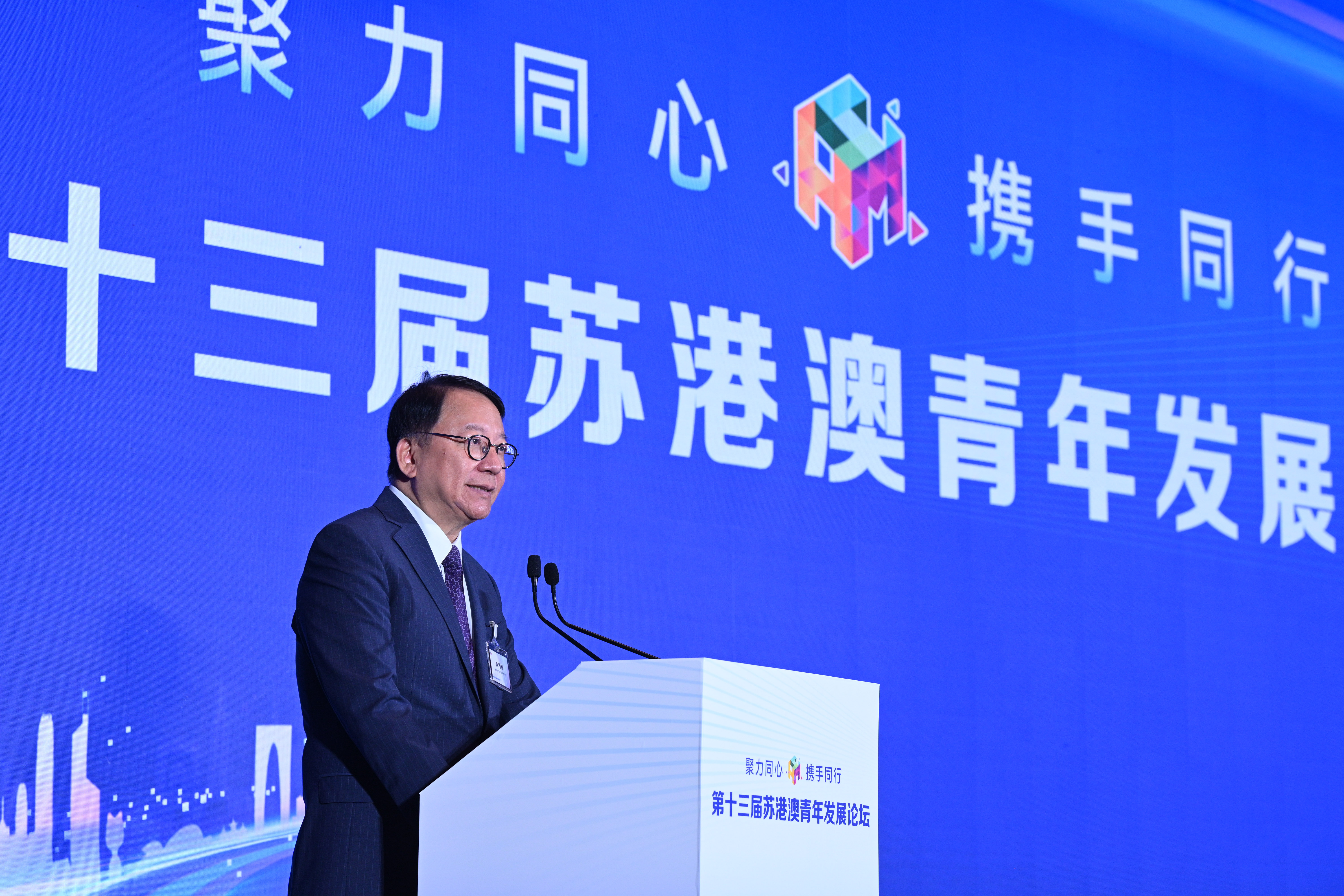 政務司司長陳國基今日(10月14日)在第十三屆蘇港澳青年發展論壇致辭,指政府目標就是匯聚社會各界的力量,培育香港廣大青年成為愛國愛港,並具備世界視野、抱負和正向思維的新一代,在社會發揮所長,貢獻香港、國家以至全世界。