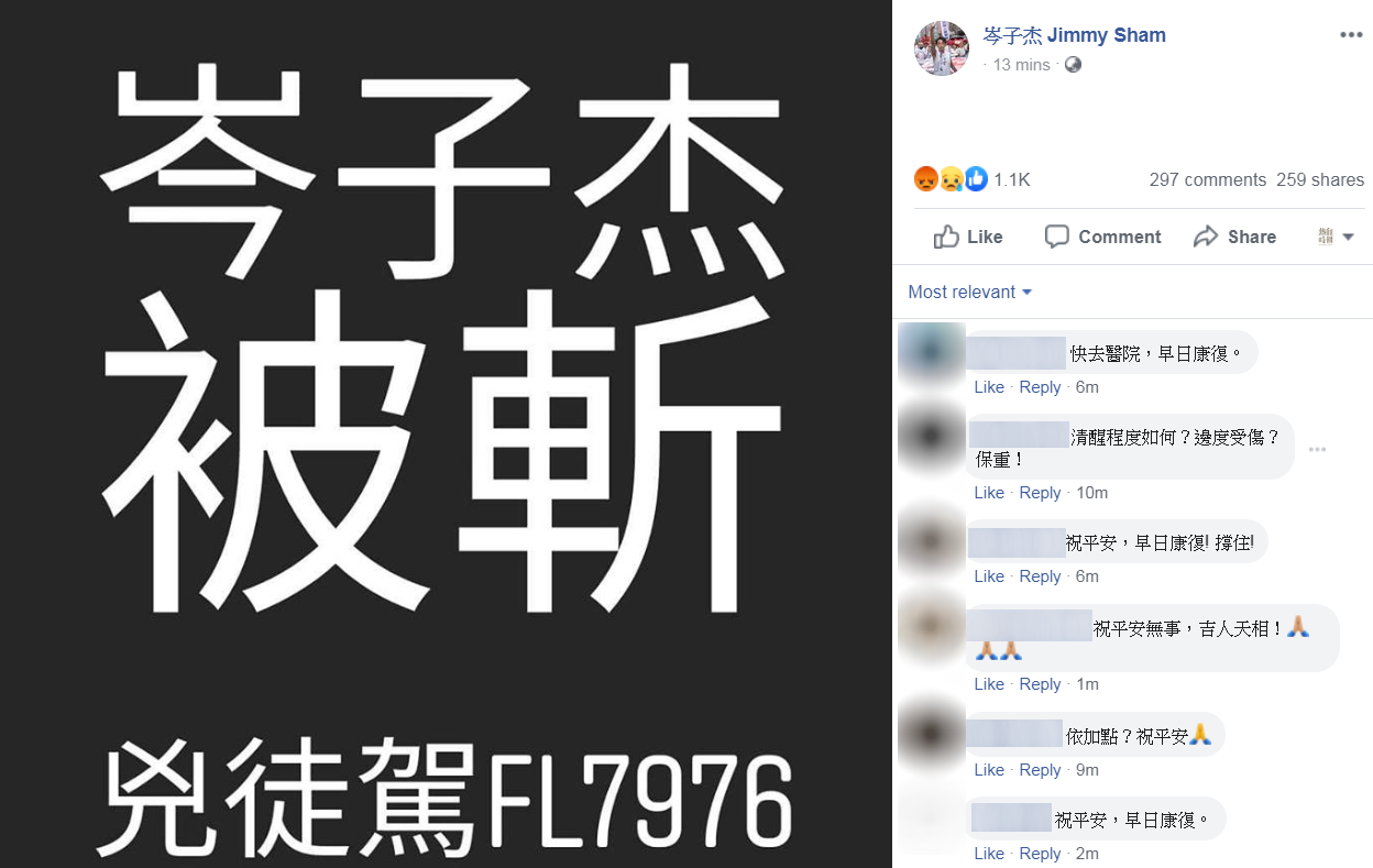 岑子杰的個人專頁亦都證實被斬消息,指兇徒駕FL7976。民陣表示,岑子杰前往旺角開會途中,在鴉蘭里被4-5名兇徒以鐵槌襲擊,頭部流血,送到廣華醫院治療,送院時清醒。民陣強烈譴責兇徒行為,事件更難免令人聯想到是散布政治恐慌,製造寒蟬效應。