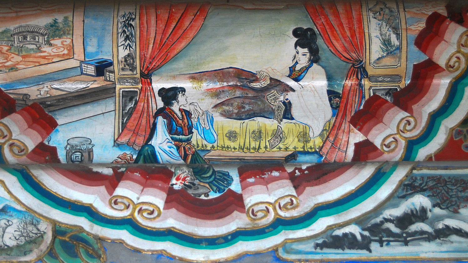 紅樓散聚大背景是賈家盛極而衰。元妃省親,得寵天恩,建造大觀園,賈家聲勢達到頂峰,小說用了「烈火烹油」四字來形容,頗堪玩味,表面指賈家之勢如烈火烹油,盛熱炙人;然而,回看第一回中甄士隱家旁的葫蘆廟,過節炸供因「烈火烹油」而失火,將甄家大宅燒毀。可知在賈家最盛之時,曹雪芹在文字裡已埋下衰敗的伏筆。
