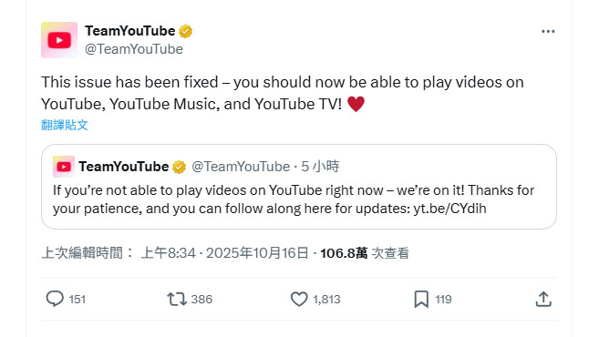 YouTube在社交平台的帖文中提到,用戶現在應該能夠在YouTube Music、YouTube TV及其主要平台上播放影片,但未具體說明死機原因。