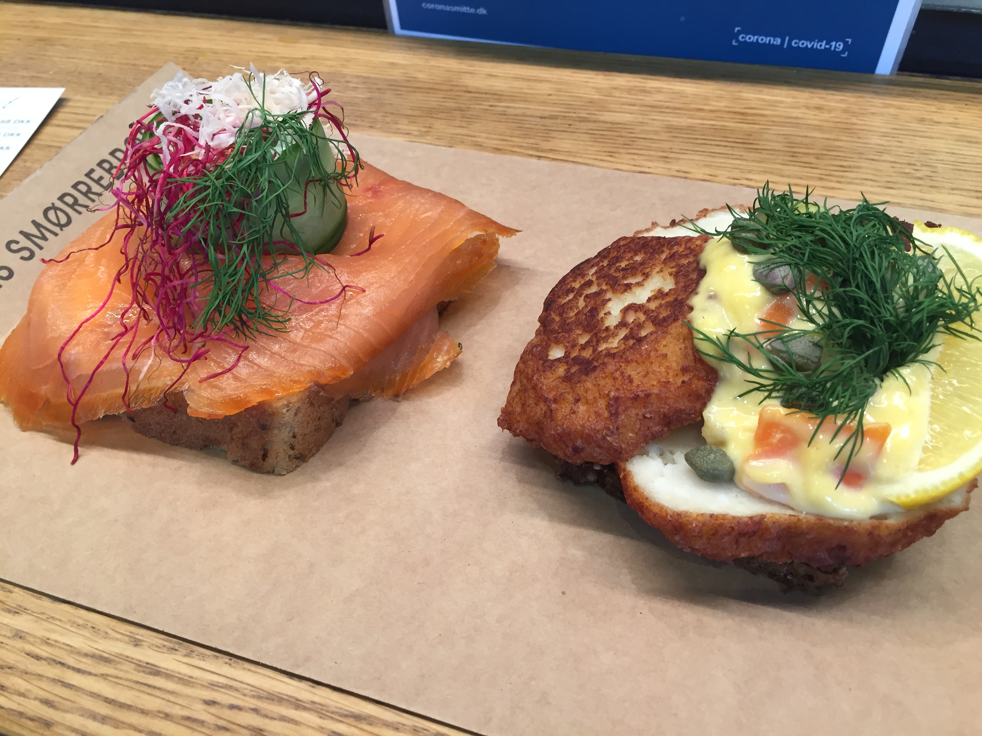 這家smørrebrød一個大約60-120DKK不等,但因為臨近關門時間,所有三文治半價。我們點了一個煙三文魚和一個丹麥魚餅的,smørrebrød的麵包是一塊稍硬微酸的黑麥麵包,塗上了一點牛油,再放材料。煙三文魚我想大家都知道是甚麼味道吧!另外的丹麥魚餅和大家熟悉的魚餅非常不同,不是平常的魚蛋質感,而是有點像日式薯餅那種鬆軟質感,咬下去還會看到一絲絲碎魚肉呢。