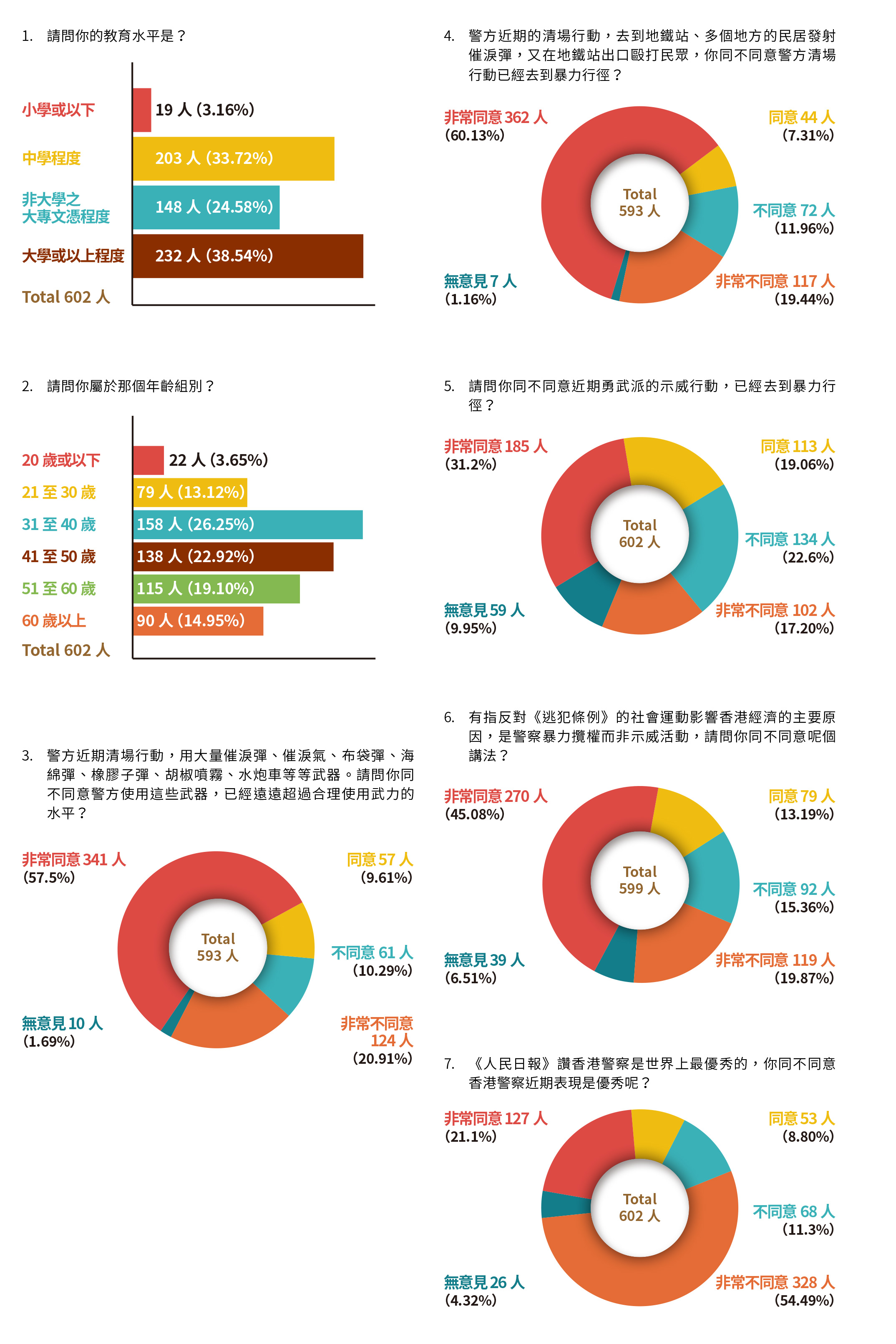 調查顯示,近七成受訪者非常同意或同意,警方清場行動已經去到暴力行徑。警方的清場行動,多次到地鐵站、民居附近發射催淚彈,8月31日晚衝入太子地鐵站肆意毆打市民,令人髮指。六成受訪者(362人,60.13%)非常同意警方清場顯然是暴力,近一成人同意(44人,7.31%),不同意的約一成(72人,11.96%),非常不同意的有近兩成(117人,19.44%),無意見的不足半成(7人,1.16%)。