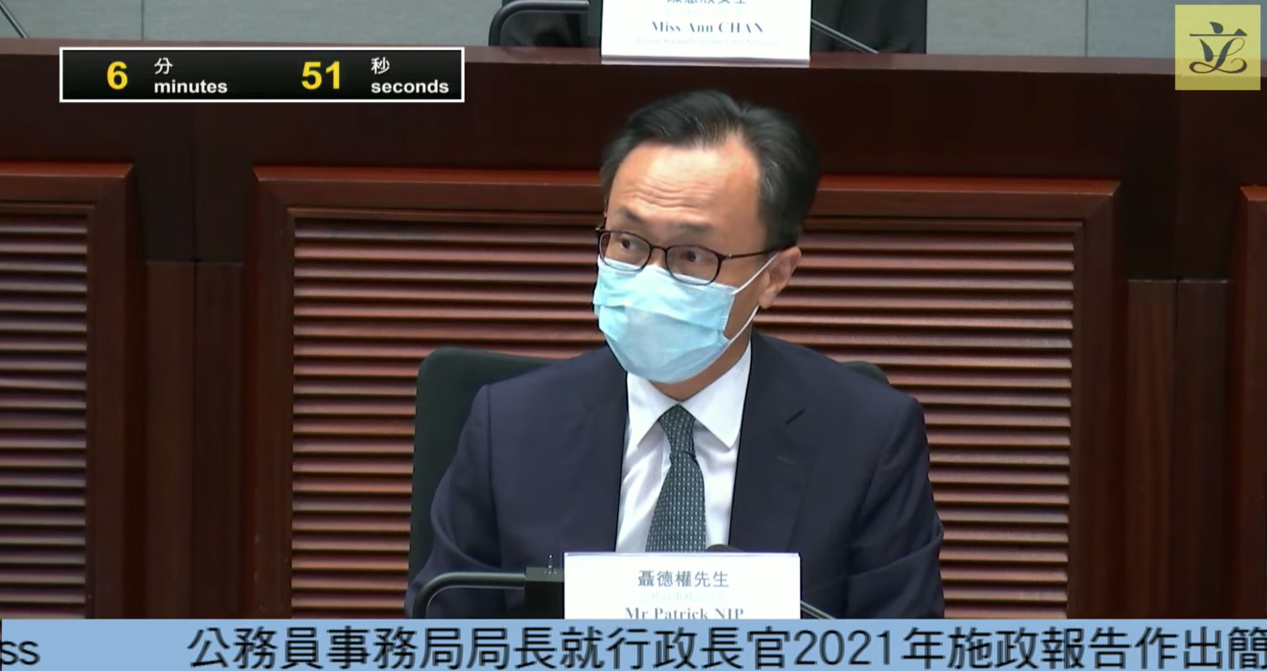立法會今日(10月19日)開會。公務員事務局局長聶德權就《行政長官2021年施政報告》有關公務員事務局政策措施發言,又指招聘公務員的《基本法》測試將納入香港國安法作考試範圍,