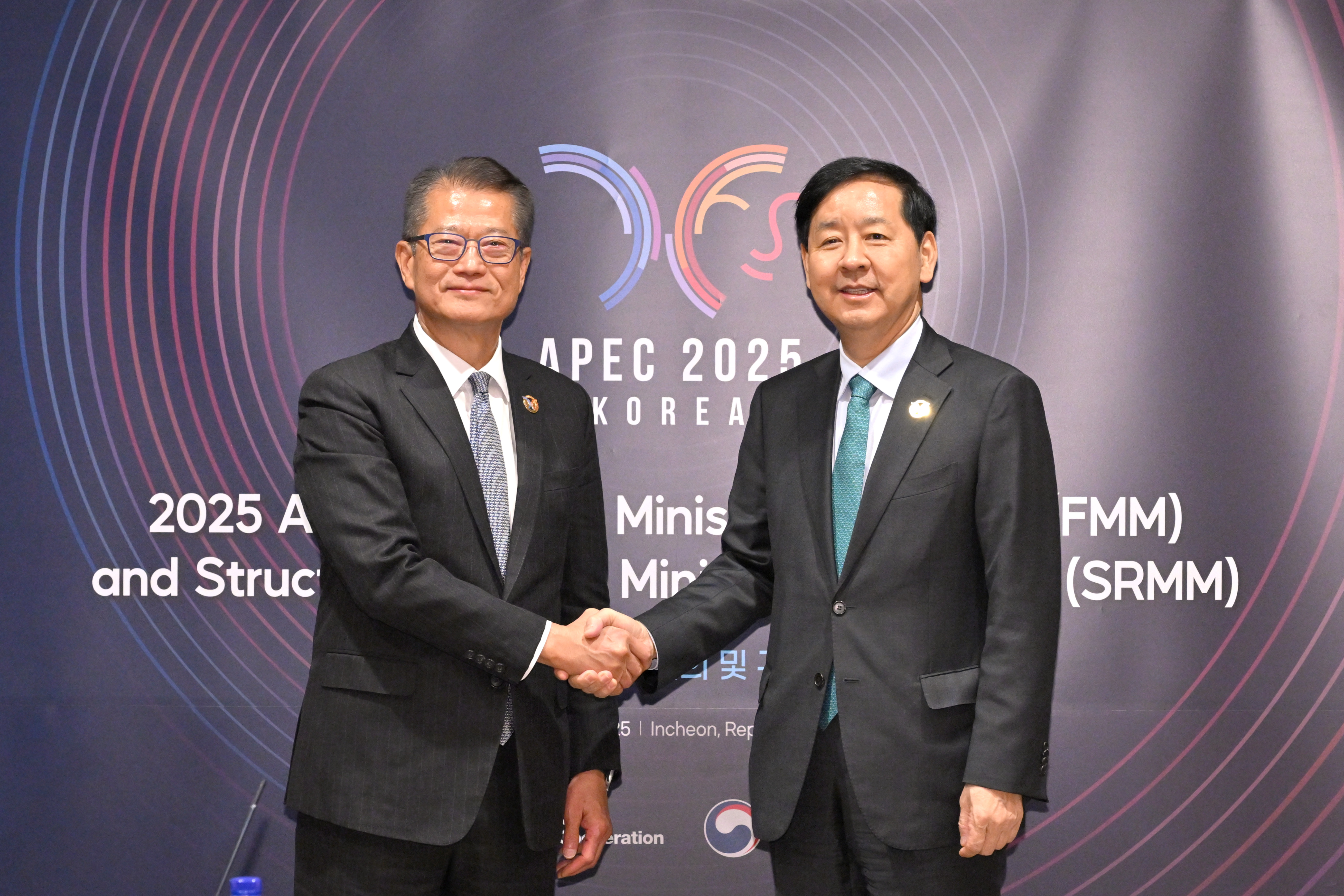 財政司司長陳茂波今日(10月21日)在南韓仁川出席亞太區經濟合作組織(APEC)財政部長會議,並與會議主席、南韓經濟副總理兼企劃財政部長官具潤哲會面。
