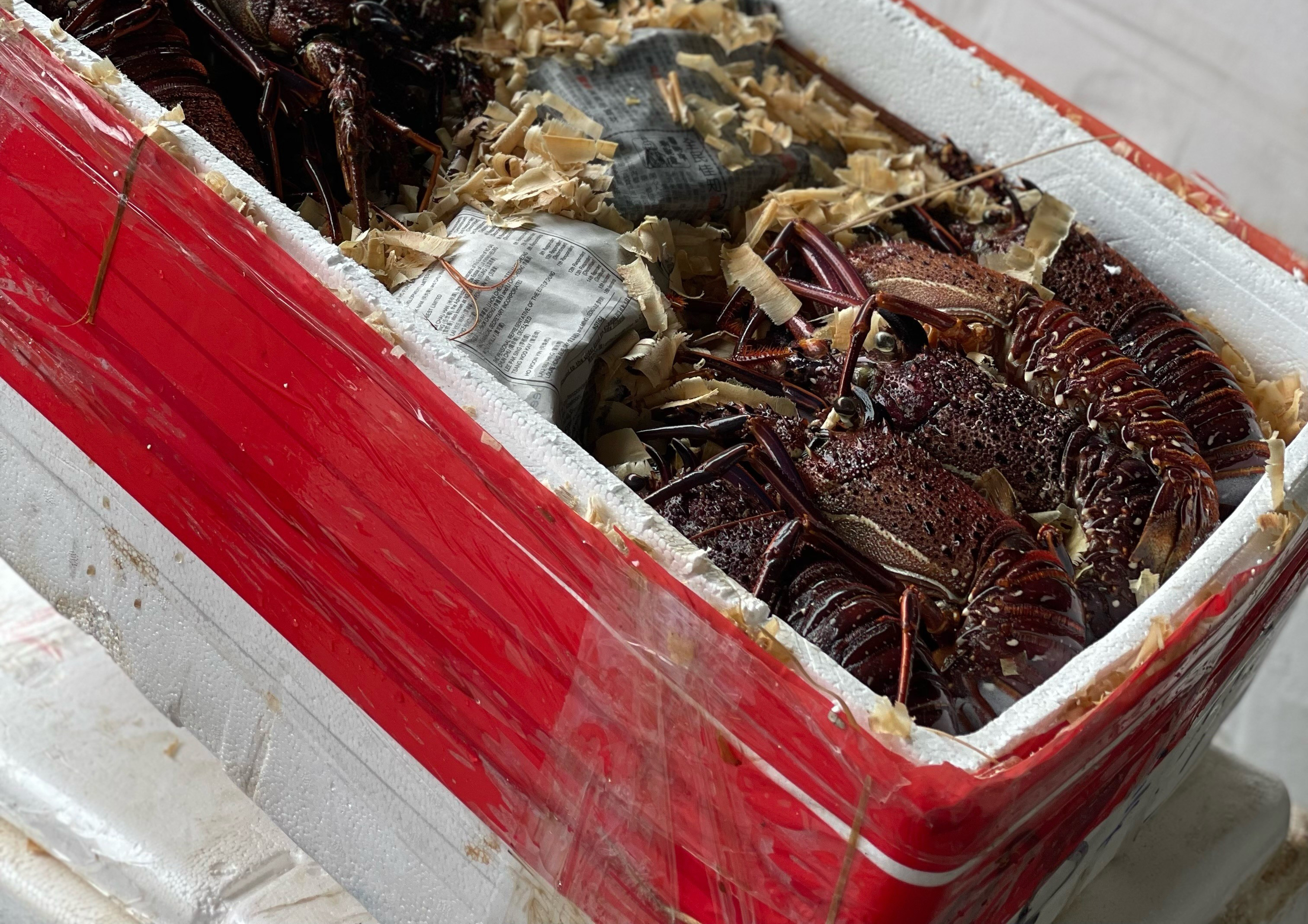 中港兩地執法人員近日共偵破3宗海上走私龍蝦案件,拘捕13名懷疑涉案人士,並檢獲共約5300公斤來自澳洲的懷疑走私龍蝦,估計市值約420萬港元。上圖示香港海關檢獲的部分懷疑走私澳洲龍蝦。