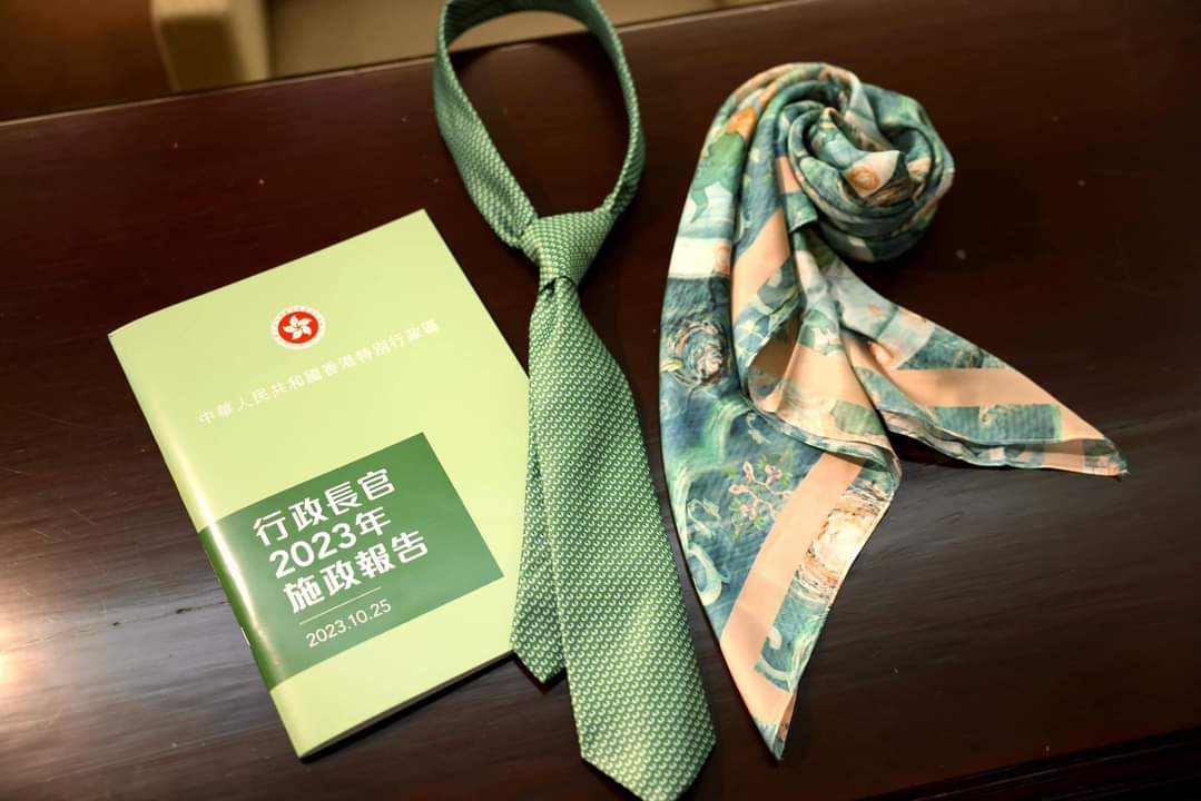 他又預告在宣讀《施政報告》當天,他和團隊將一同穿戴由香港知專設計學院(HKDI)師生攜手設計製作的綠色領呔和領巾,除了希望更加突出政府團隊的「隊形」及團結精神之外,亦有另一番意義。