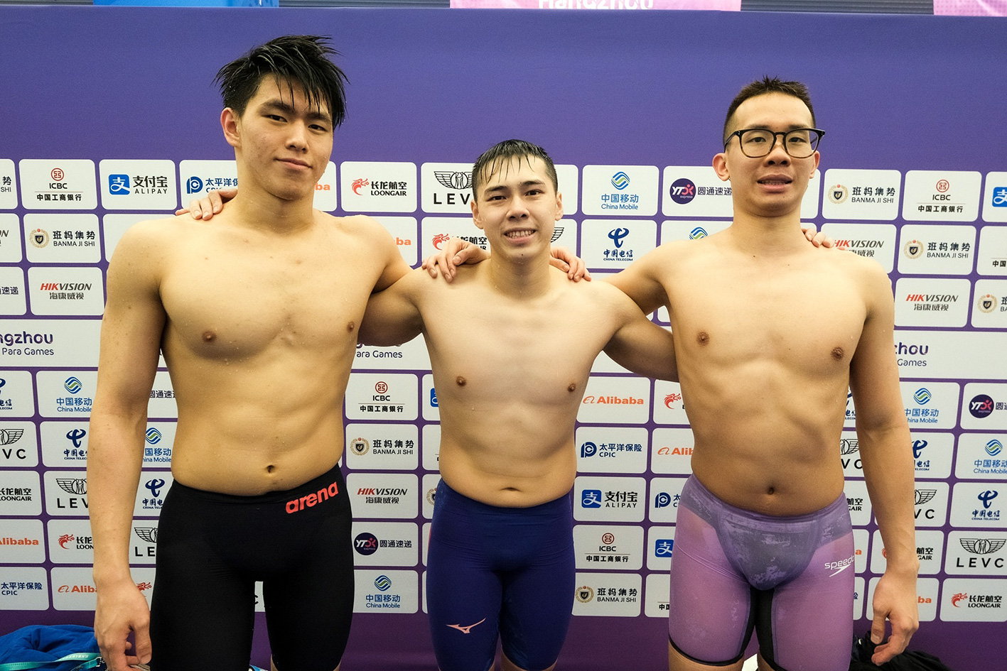 港隊泳手鄧韋樂(圖中)在杭州第4屆亞殘運男子S14級別200米自由泳勇奪金牌,兼破亞殘運紀錄,他的隊友張浚諾和黃漢彥(圖左及右)亦分別取得銀、銅牌。至於輪椅劍擊選手余翠怡亦取得佳績,在女子A級花劍個人賽奪得銅牌。