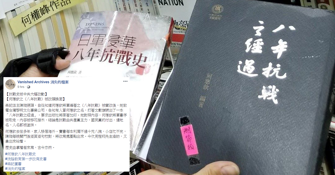 據FB專頁「消失的檔案」帖文,森記店主陳琁發現近年有人盗用國民黨將軍何應欽之名,出版《日本侵華八年抗戰史》,竄改書中序言,內容移花接木,推出抗戰是由共產黨主力的結論。