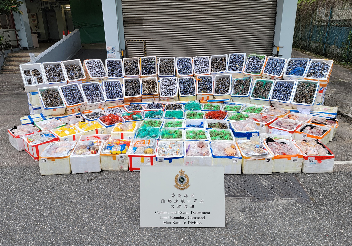 香港海關與食環署10月22日在文錦渡管制站進行聯合行動,檢獲約17000隻懷疑走私大閘蟹及約1.1噸懷疑走私冷凍食品,估計市值共約159萬元,47歲貨車男司機被捕。