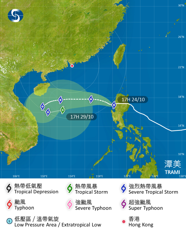 根據現時預測,強烈熱帶風暴「潭美」快將進入本港800公里範圍,天文台會在周五(10月25日)凌晨零時至3時之間發出一號戒備信號。