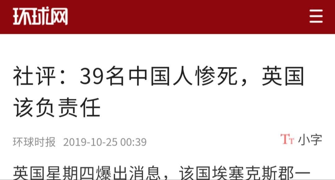 英國埃塞克斯郡一輛冷藏貨車裡發現的39具屍體,周四爆出死者全部是中國人。《環球時報》今日(10月25日)刊登社評,指「39名中國人慘死,英國該負責任」。