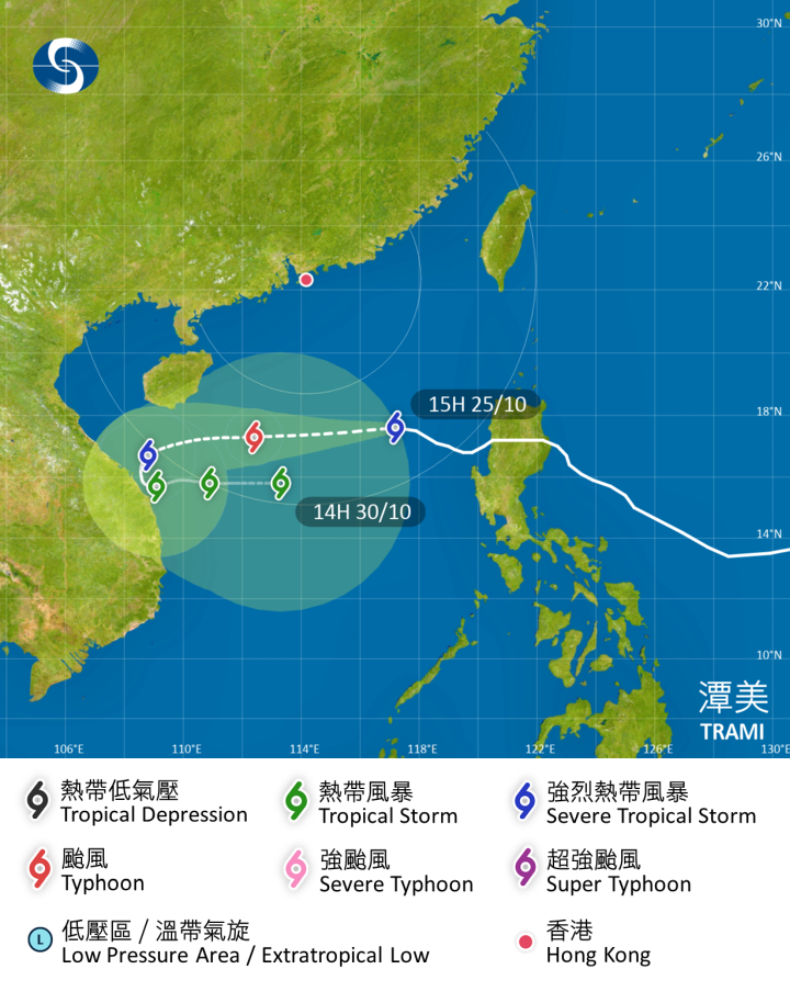 天文台預料「潭美」明早在香港以南約500公里掠過,但隨著「潭美」逐漸移向本港西南面,本港明日稍後會轉吹偏東風,原先受屏蔽的地區可能會變得當風。而與「潭美」相關的雨帶亦會逐漸影響廣東沿岸。天文台會視乎「潭美」相關的強風區與珠江口的距離,以及本地風力變化,評估是否需要在明日日間改發三號強風信號。
