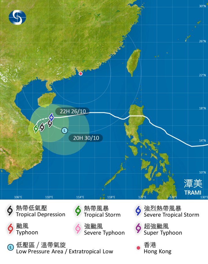 在晚上10時,強烈熱帶風暴「潭美」集結在香港之西南約710公里,即在北緯17.0度,東經110.4度附近,預料向西南偏西移動,時速約15公里,移向越南中部沿岸。