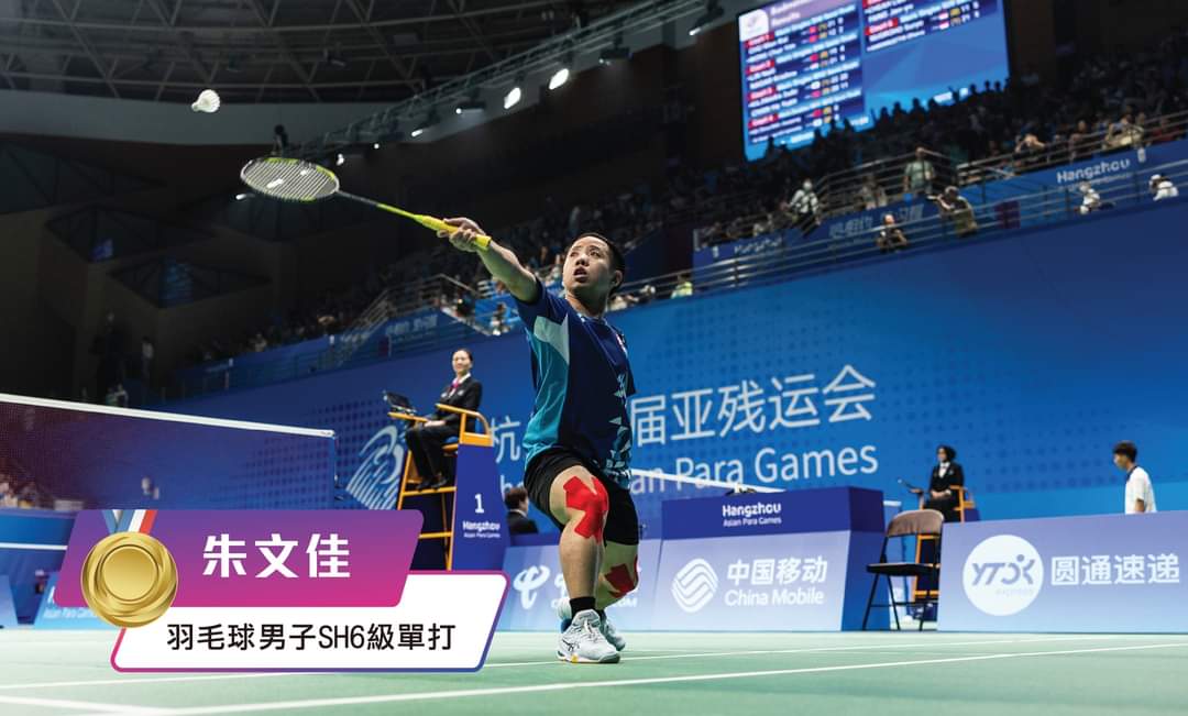港隊於杭州亞殘運再添一金,今日(10月27日)上午的羽毛球男子SH6級單打決賽上,現時世界排名第一位的朱文佳與印度球手激戰三局後,以21:10、8:21、21:11取勝,連續兩屆亞殘運奪得單打金牌,亦是港隊今屆的第六面金牌。