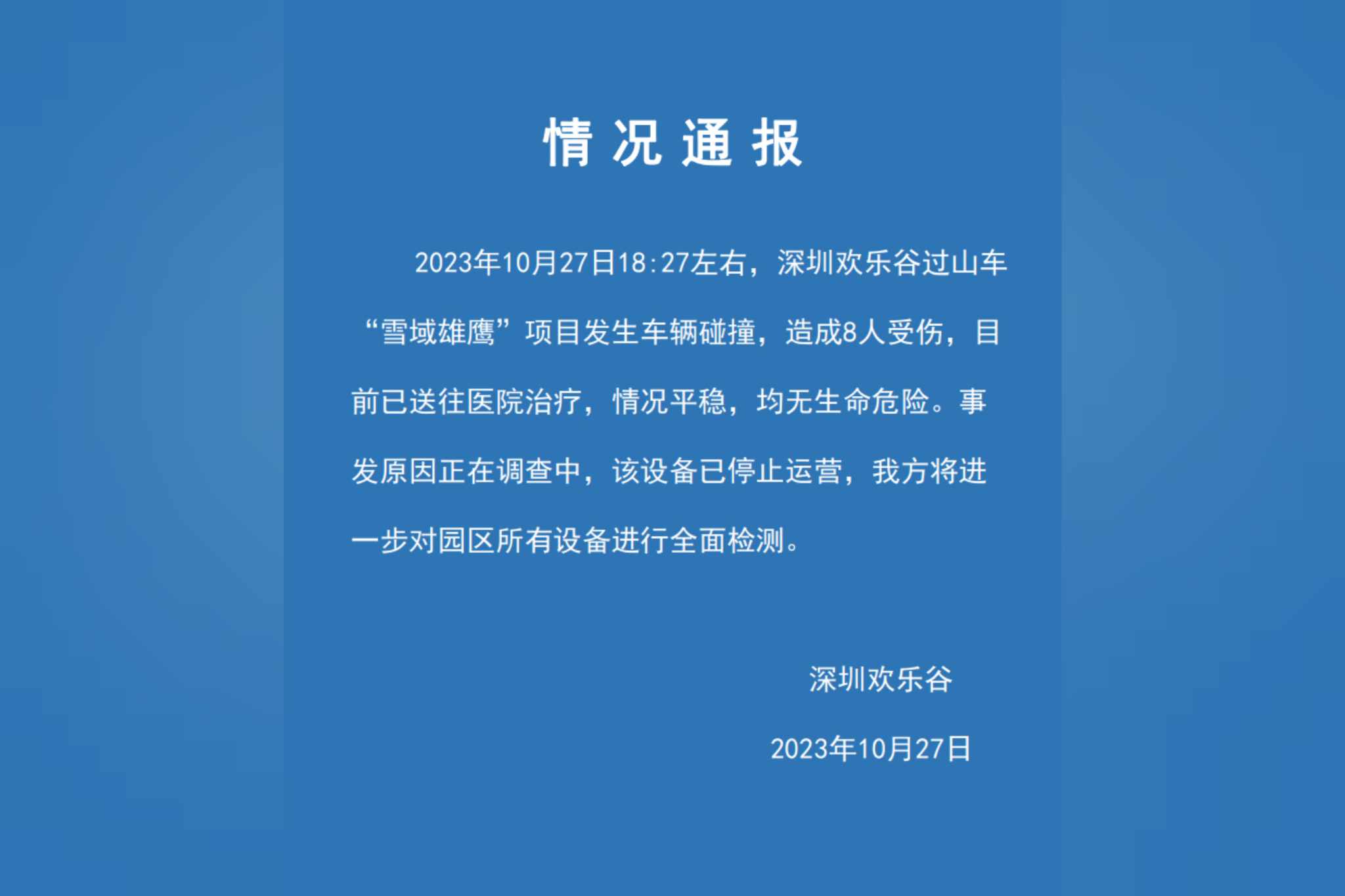 深圳歡樂谷發聲明,指今日(10月27日)傍晚6時半,過山車「雪域雄鷹」發生車輛碰撞,造成8人受傷,目前已送院治療,情況平穩,無生命危險。